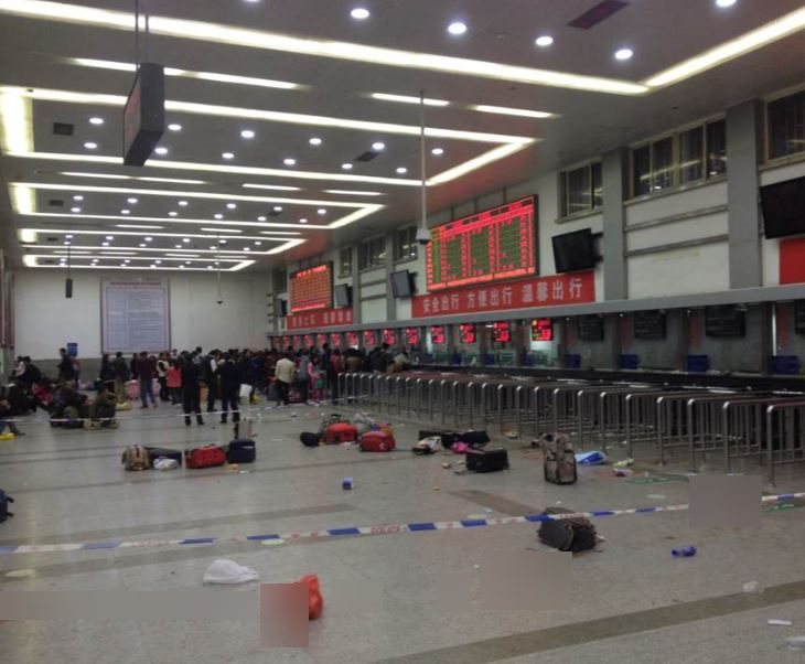5人開始攻擊后,由臨時候車區(qū)開始,經站前廣場、第二售票區(qū)、售票大廳、小件寄存處等地,不斷斬殺旅客途人。