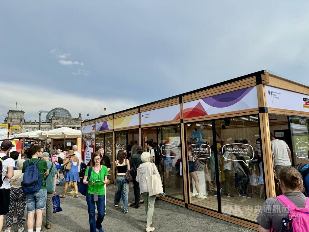 ▲柏林上周末展開為期三天的基本法75周年慶?;顒?dòng),聯(lián)邦政府各部門于國會(huì)大廈前向民眾介紹部門的日常工作與政策目標(biāo)。圖源:中央社