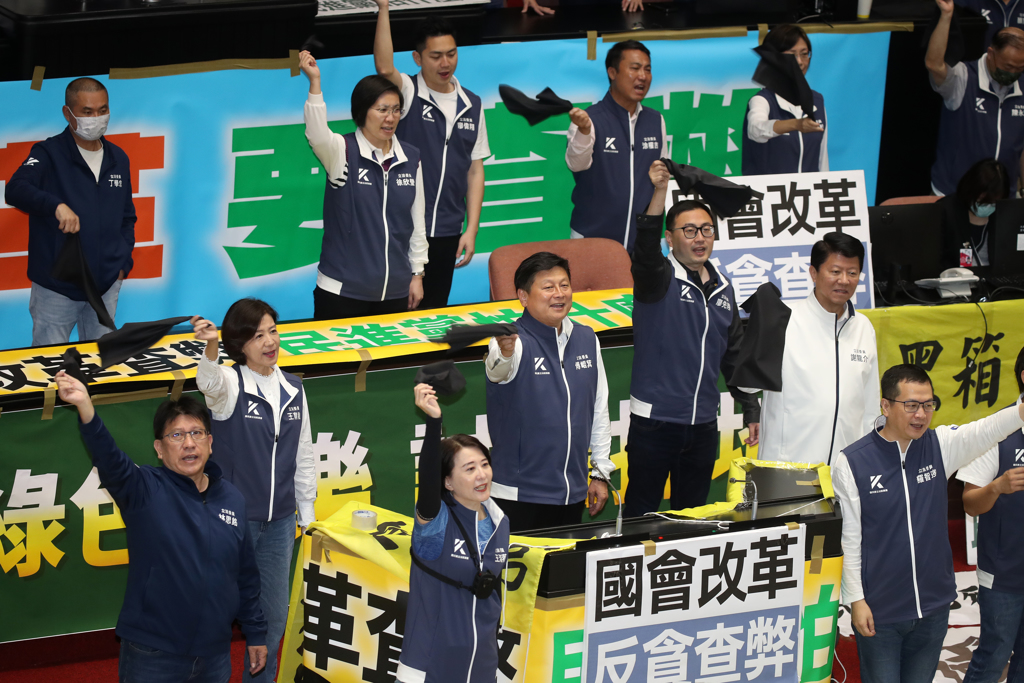 ▲臺灣立法機構(gòu)院會28日續(xù)審“國會”改革相關(guān)法案,表決大戰(zhàn)前,國民黨民意代表們揮著黑布,高喊“掀開黑布、反貪腐、查弊案”。(劉宗龍攝)