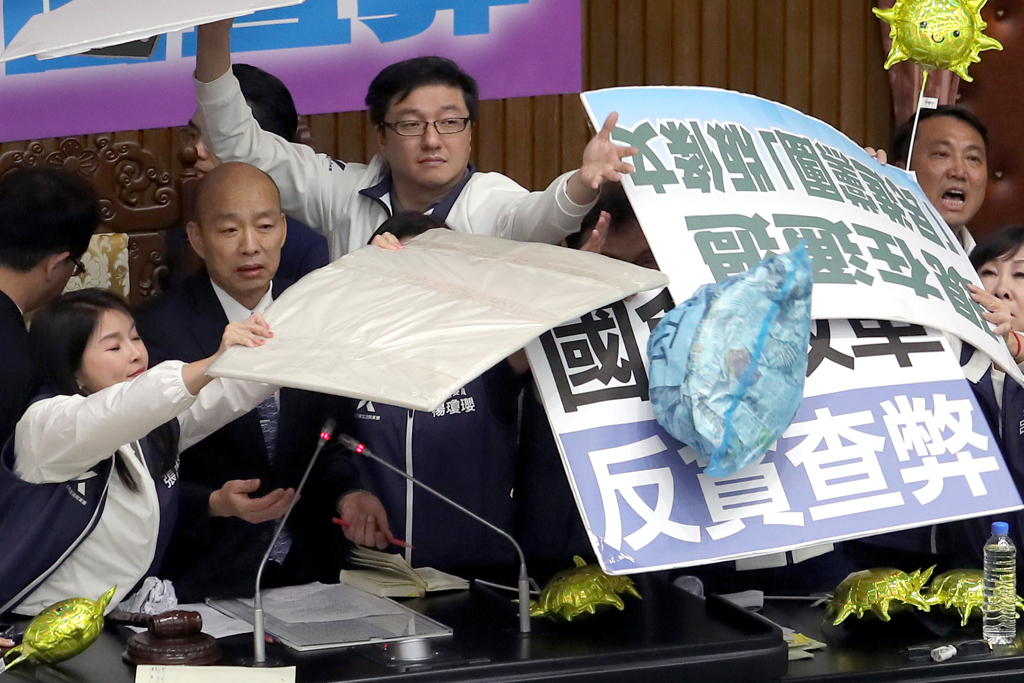 ▲臺灣立法機構(gòu)院會28日續(xù)審“國會改革”相關(guān)法案,進(jìn)入三讀程序時,民進(jìn)黨“立委”將寫上“垃圾”字樣的藍(lán)色塑料袋丟上主席臺抗議,國民黨“立委”們舉起牌子阻擋,保護(hù)立法機構(gòu)負(fù)責(zé)人韓國瑜(左二)。(來源:中時)