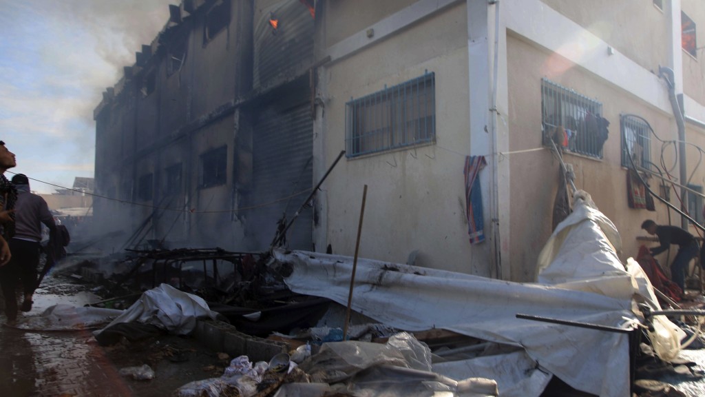 ▲以色列坦克中汗尤尼斯近東救濟工程處(UNRWA)職業(yè)培訓(xùn)中心,這里被巴勒斯坦難民用作避難所。美聯(lián)社