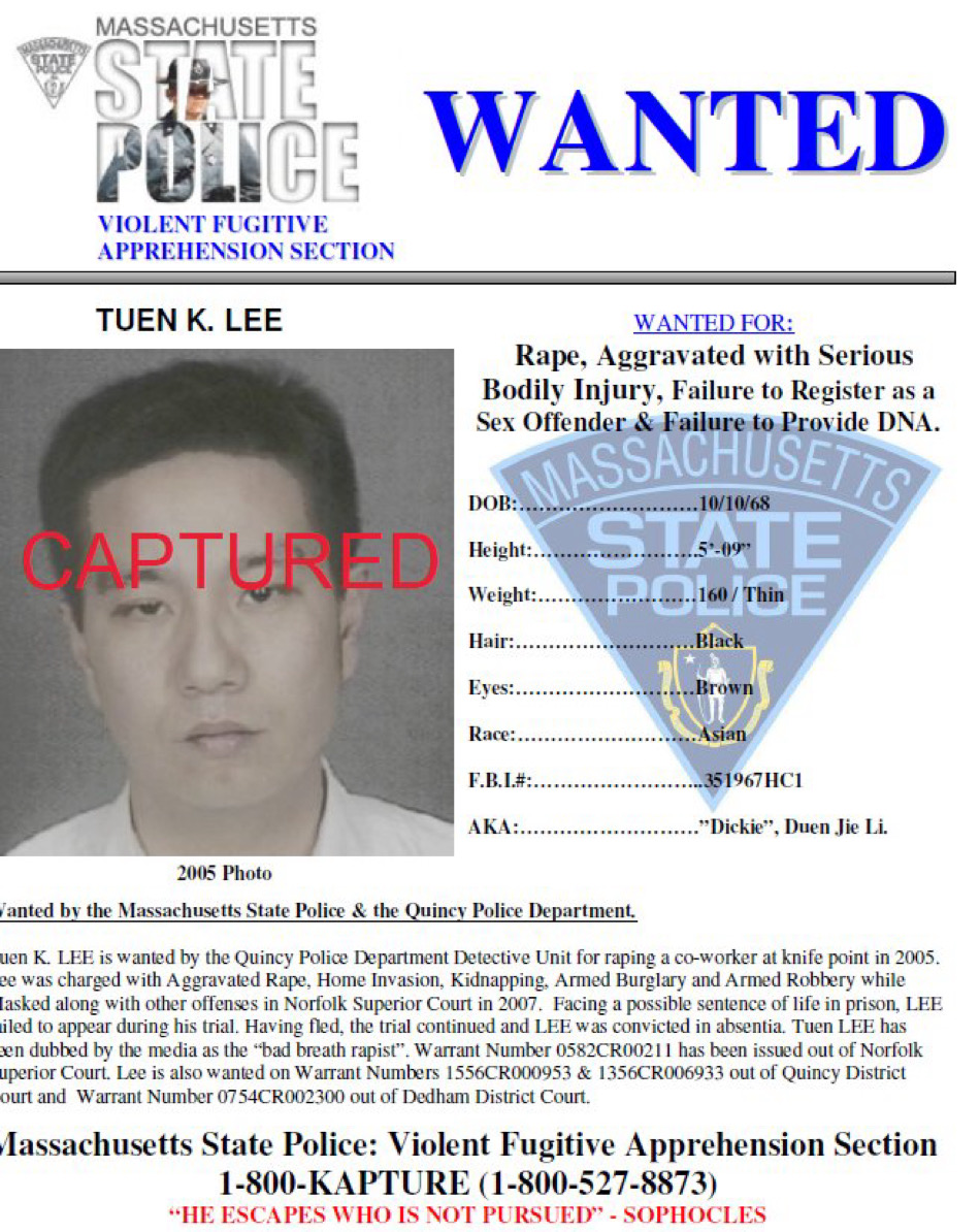 麻省警方隨后懸賞1萬美元(約7.8萬港元)追捕李端杰。電視節(jié)目《美國頭號通緝犯》(America’s Most Wanted)也曾多次提及此案。之所以有“口臭強(qiáng)奸犯”的稱號,是因為除了DNA罪證,受害人也憑口氣認(rèn)出李端杰。