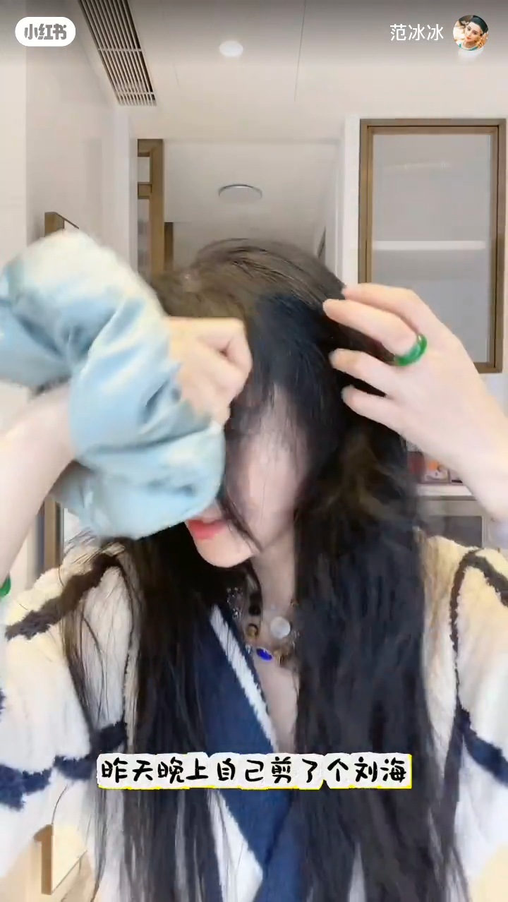 范冰冰在房間整理儀容準備出門,自爆會自己剪瀏海。