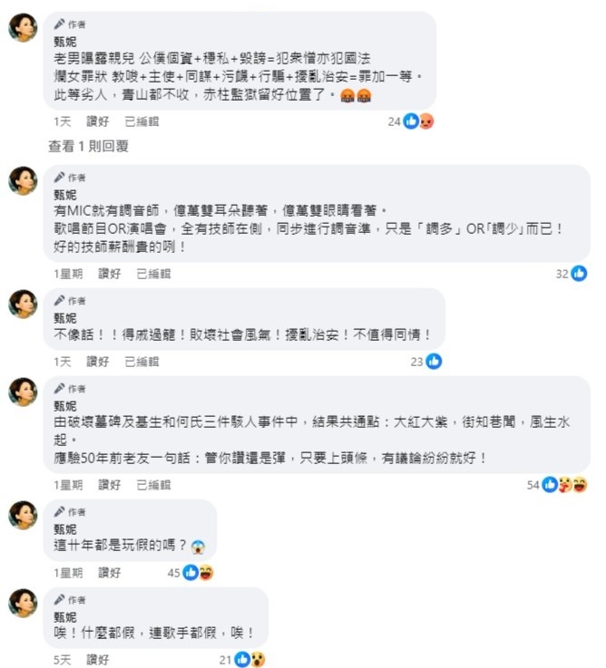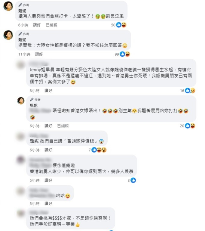 與網(wǎng)民討論嫁港漢的原因時,甄妮坦言不懂回答:“姐問我:大陸女性都是這樣的嗎?我不知該怎么回答”,甄妮更認為是助長歪風:“還有人要與他們合照打卡,太變態(tài)了!助長歪風”、“一上街就丟他她臭雞蛋,看你再囂張。不用給臉,連《東張》一起丟,助肘為虐,拒看?!?/p>