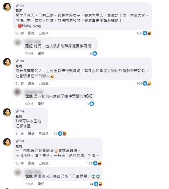 甄妮在帖文未有開名,卻在留言續(xù)寫道:“開年至今天,己(已)有二例,都是大陸女子,香港老男人,皆成功上位,大紅大紫??峙录海ㄒ眩┯幸欢雅伺抨?,效法來港發(fā)財,香港真是個超級福地!I Love Hong Kong!沒天良鬧事的人,上位全都賺得樂陶陶,有良心的香港人卻仍然是剩得苦哈哈,社會現(xiàn)象扭曲的嚇人。”甄妮之前曾在另一帖文直斥:“老男曝露親兒,公仆個資+穩(wěn)私+毀謗=犯衆(zhòng)憎亦犯國法。爛女罪狀:教唆+主使+同謀+污蔑+行騙+擾亂治安=罪加一等。此等劣人,青山都不收,赤柱監(jiān)獄留好位置了。”