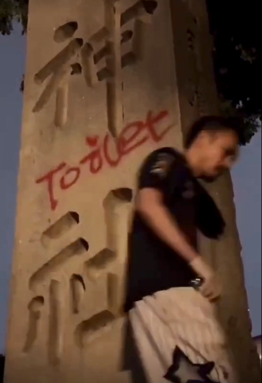 根據(jù)小紅書影片,“鐵頭”1日凌晨與朋友一同前往靖國神社,先爬上寫有靖國神社4個大字的石柱脫褲撒尿,隨后拿出事先準備的紅色噴漆,在石柱上寫上“廁所”的英文,相關影片隨即引發(fā)熱議。