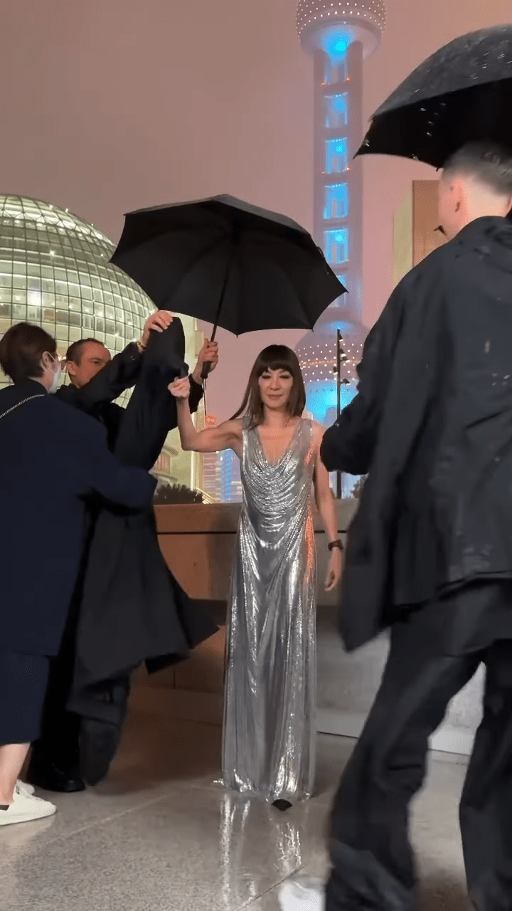 ▲當(dāng)日上海下起毛毛雨,短片見楊紫瓊獲至少4名工作人員護(hù)駕。
