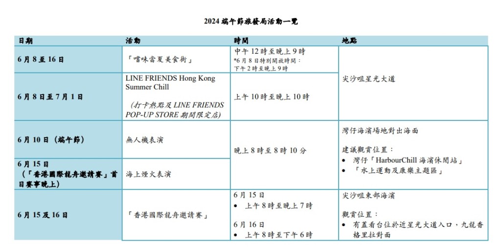 頭炮于6月8日登場(chǎng),尖沙咀星光大道進(jìn)駐多個(gè)消暑美食檔及LINE FRIENDS全新打卡熱點(diǎn);6月10日及15日,灣仔分別有端午節(jié)主題無(wú)人機(jī)及海上煙火表演;6月15及16日一連兩天,尖東海旁則有年度盛事“香港國(guó)際龍舟邀請(qǐng)賽”壓軸上演。