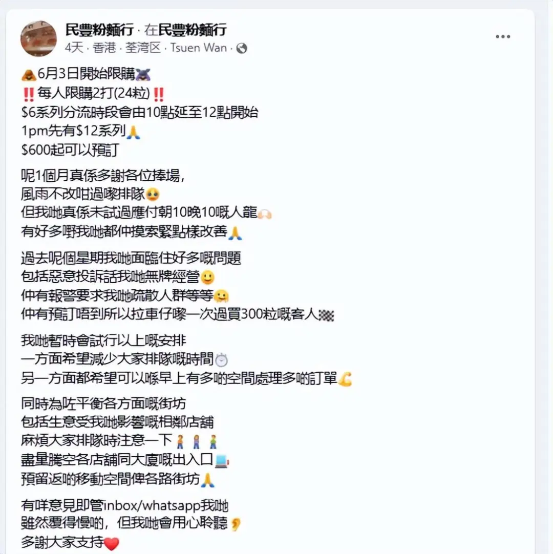 民豐粉面行在社交平臺上更表示,曾有客人因為預訂不到,而選擇拉車子到店一次性買300粒糯米滋,進一步增加其他客人排隊的時間。更有被惡意投訴“無牌經(jīng)營”、報警要求疏散人群等。