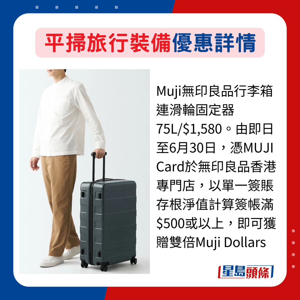 品牌大減價(jià)之外,憑指定信用卡或會(huì)員身份選購(gòu)亦有優(yōu)惠。于6月30日或前,以MUJI Card于無(wú)印良品香港專門店每次消費(fèi)簽帳滿$500或以上,可獲贈(zèng)雙倍Muji Dollars。另SOGO Rewards會(huì)員或持中銀崇光Visa卡的話,于6月16日或前在銅鑼灣崇光百貨9樓購(gòu)買指定行李箱,即享折扣,惟數(shù)量有限,大家要把握時(shí)間掃貨!
