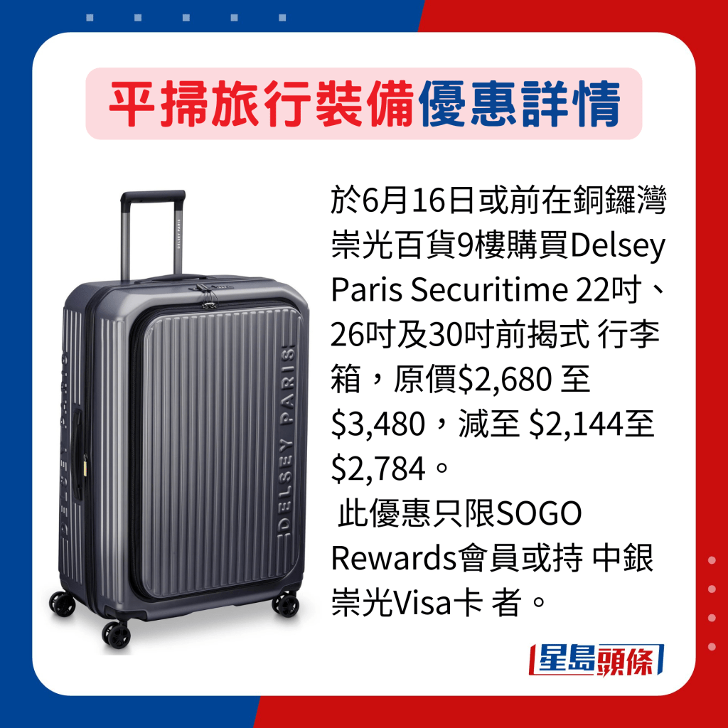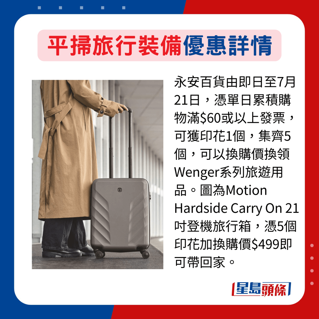 即將迎來暑假,又是外游旺季,預(yù)訂好機(jī)票、酒店或旅行團(tuán)后,就要著手準(zhǔn)備行裝。行李箱、旅行袋、收納袋及便攜式數(shù)碼科技用品等,都是外游必備,把握各大商戶及品牌現(xiàn)正推出的購(gòu)物優(yōu)惠,以及會(huì)員專享禮遇等,趁平價(jià)選購(gòu)心水用品,省回來的錢可用于旅程中盡情吃喝玩樂,提升性價(jià)比。