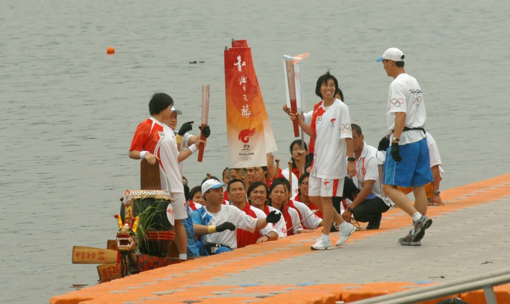 北京奧運于2008年舉行,當時圣火傳遞到香港時,并在香港城門河以龍舟傳遞的方式進行,當日9條龍舟競發(fā),并由多哈亞運會女子4X100米自由泳接力銅牌得主施幸余,高舉奧運火炬立于傳遞火炬的龍舟船頭,整個1200米水程,歷時9分鐘。