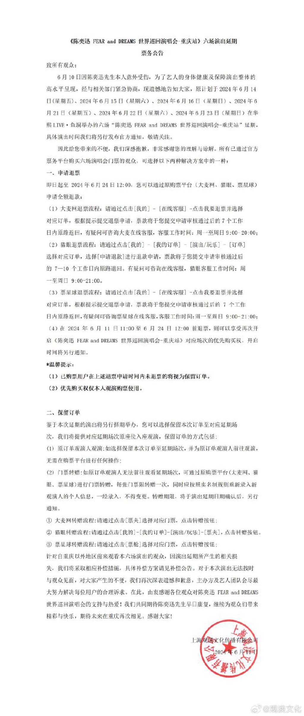 關(guān)于延期和補(bǔ)償方案,主辦單位表示開放歌迷進(jìn)行全額退票,倘若愿意保留票根等到2025年演唱會(huì)重啟,不僅能保留對(duì)應(yīng)場(chǎng)次的座位,從外地前往重慶觀賞的歌迷,將采實(shí)報(bào)實(shí)銷方式補(bǔ)貼交通以及住宿費(fèi)用,對(duì)于造成眾人不便感到非常抱歉,也會(huì)盡全力完成所有人合理訴求,等待陳奕迅康復(fù)后,再次于重慶與所有人見面。