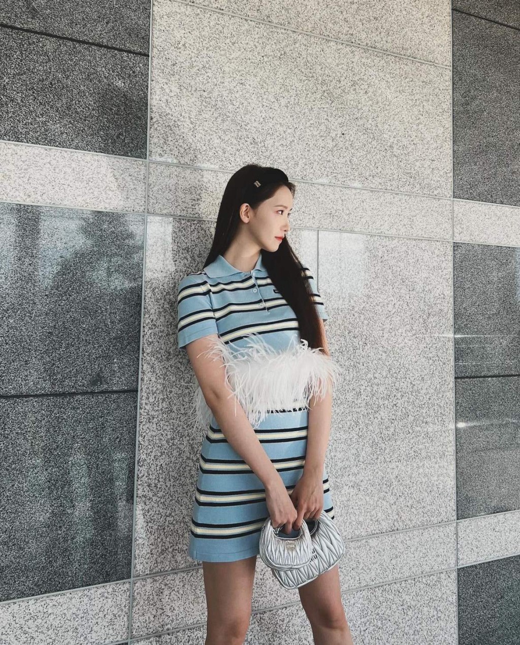 韓星允兒以Polo Shirt及迷你裙,襯以Miu Miu黑色粗發(fā)箍,造型充滿學(xué)院風(fēng)格。 (圖片來(lái)源:IG@yoona__lim)
