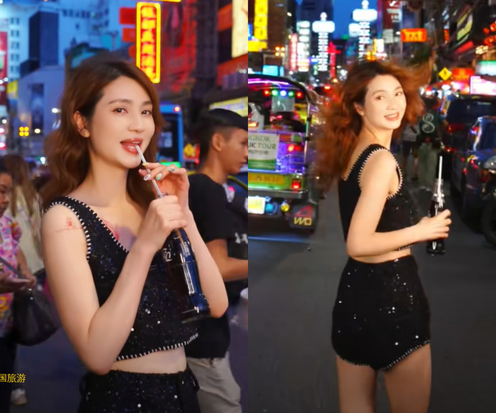 ▲洪欣現(xiàn)身泰國街頭,一身火辣造型吸引路人目光。(圖/抖音 洪欣)