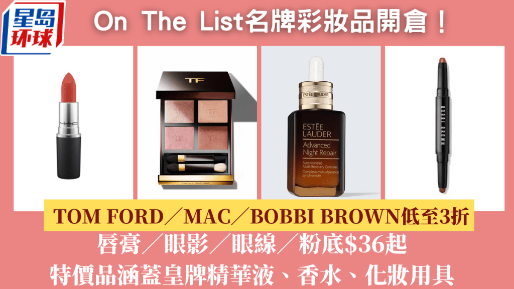 OnTheList名牌彩妝護(hù)膚品開倉優(yōu)惠3折起! 由即日起至6月19日,OnTheList購物平臺(tái)網(wǎng)站推出TOM FORD、Estée Lauder、MAC、BOBBI BROWN等化妝及護(hù)膚品開倉大減價(jià),眼影、粉底、唇膏,以至護(hù)膚精華液、化妝用具低至$36,大受女生歡迎的Estée Lauder Advanced Night Repair精華液4折后只售$579,記得留意優(yōu)惠詳情入手!
