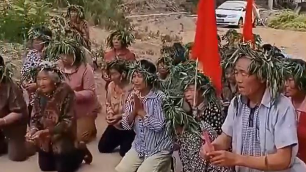 網(wǎng)傳影片顯示,有民眾頭戴樹枝編織的草帽,跪拜在龍王廟前求雨。有村民口中念念有詞,祈求老天降雨救莊稼免于枯死。