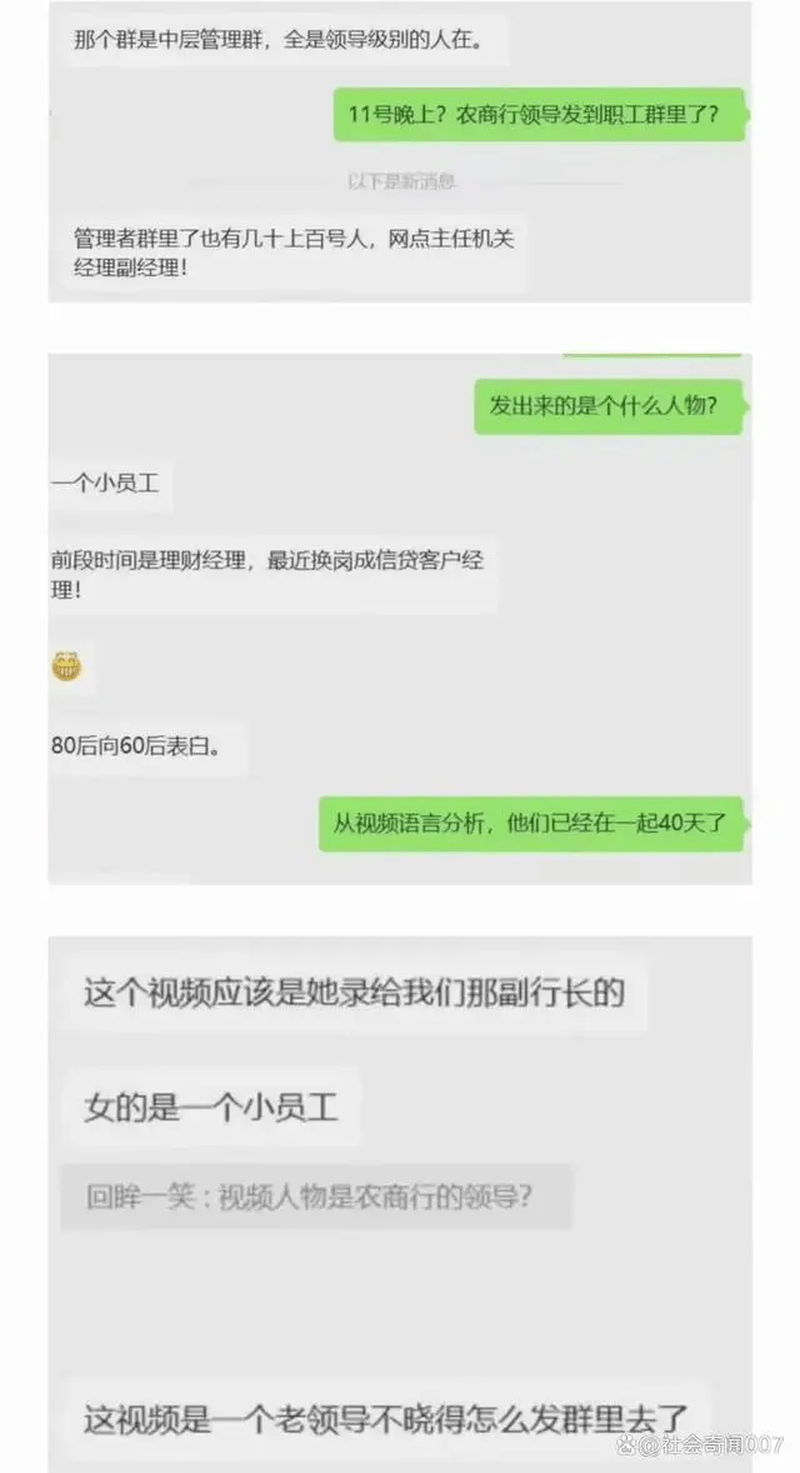 另外,網(wǎng)傳一段聊天截圖顯示,拍攝影片的女主角是該行的一名小職員,而那個群是該行的中層管理群,全都是領導級別的人。有人從影片內(nèi)容指出。他們已經(jīng)在一起40天了,更有人聲稱女職員的老公也在群里,2人皆已婚,疑似出軌。