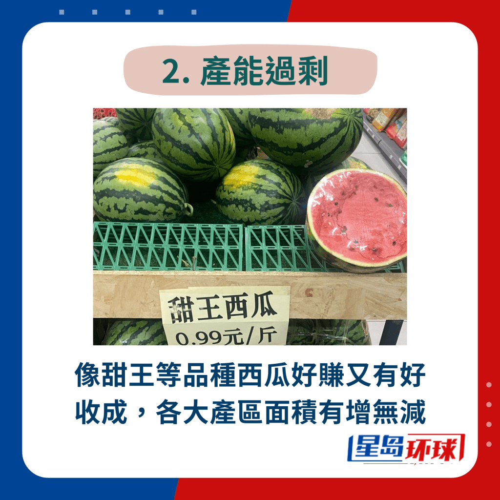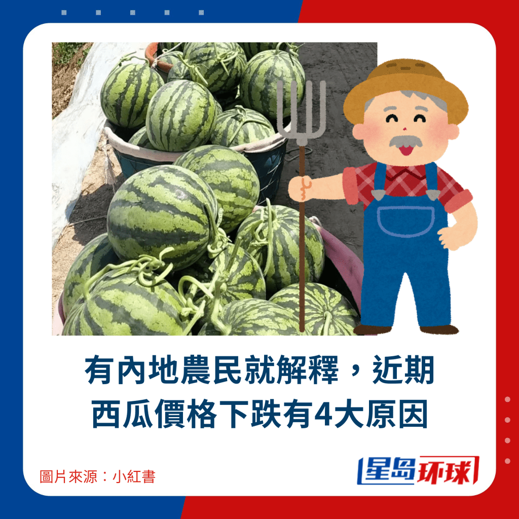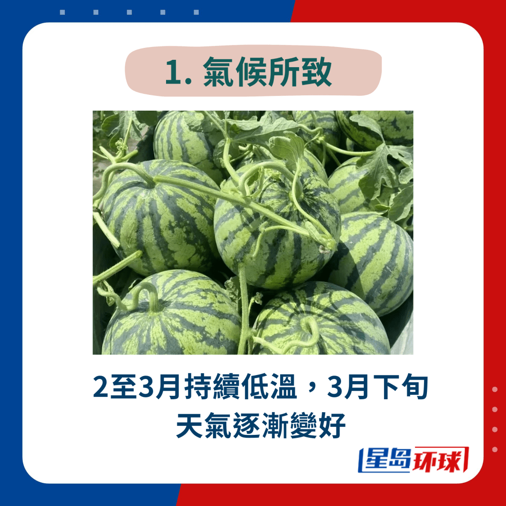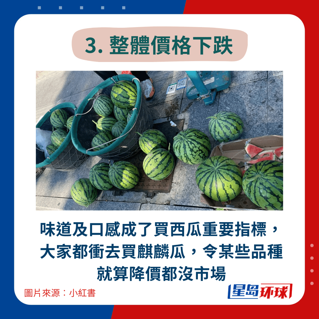 究竟為何今年的西瓜會賣得這么便宜?有內(nèi)地農(nóng)民就解釋,近期西瓜價格下跌有4大原因,主要原因是天氣影響,令西瓜產(chǎn)量增多,要大幅劈價賣出,否則會滯銷。加上消費者近年更“識食”,購買西瓜時會較著重口感及味道,令一些品種如黑皮、甜王等沒人購買,要大幅降價促銷。