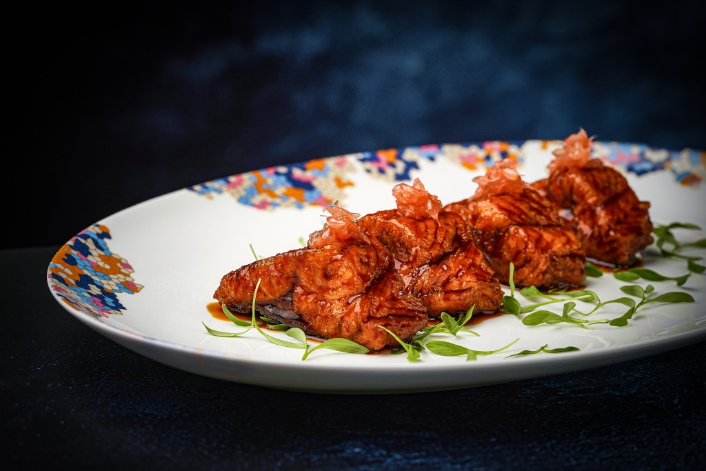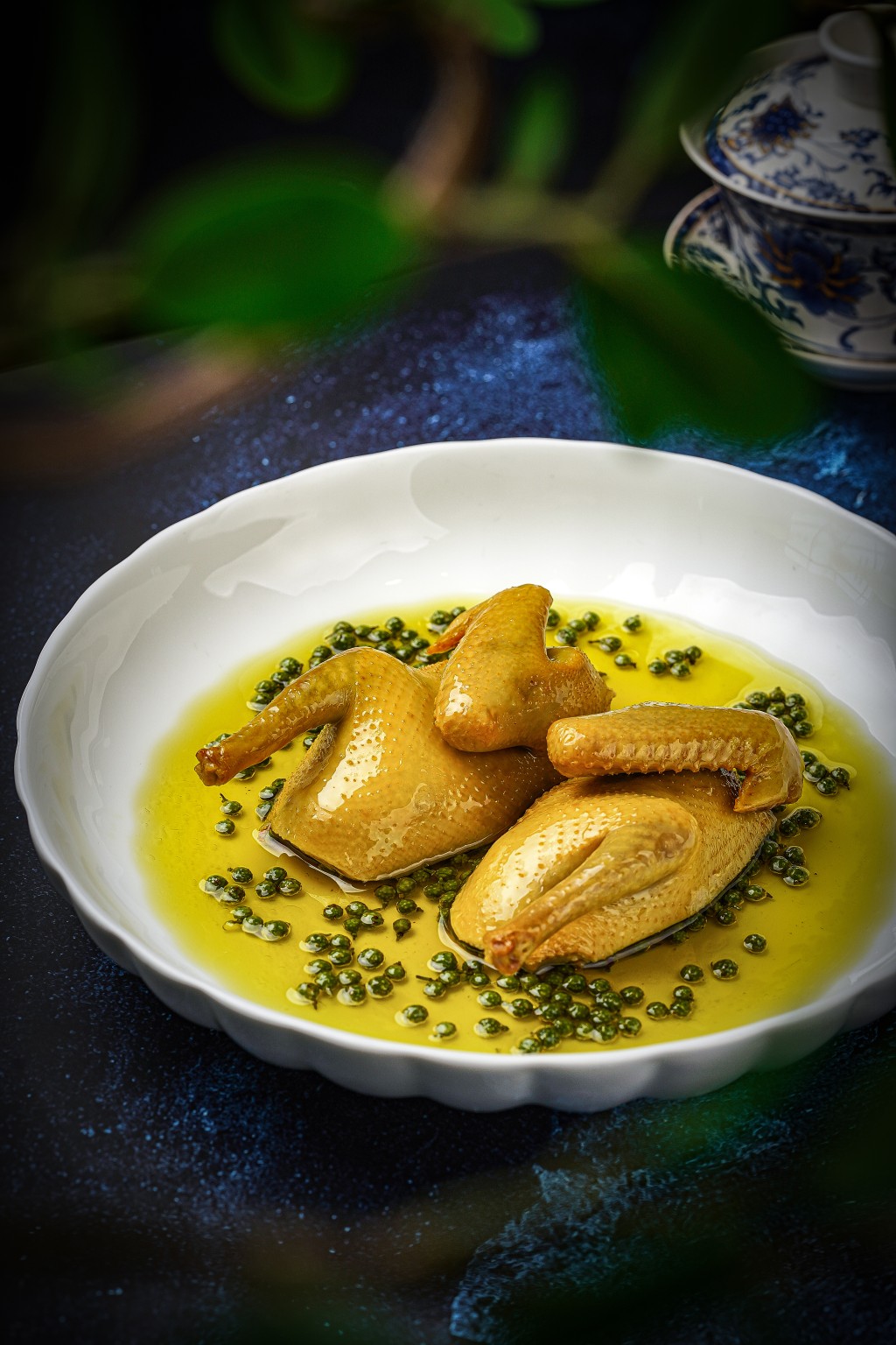 菜單上,不少也是見(jiàn)慣見(jiàn)熟的傳統(tǒng)江南菜式,卻又在調(diào)味與食材上用心。如改良自傳統(tǒng)燻魚(yú)的“柚香燻鱈魚(yú)”($368),以刺少而肉嫩的銀鱈魚(yú)代傳統(tǒng)草魚(yú),為了去除魚(yú)腥味,團(tuán)隊(duì)更巧妙使用柚子皮汁水醃制;鱈魚(yú)炸起來(lái)外脆內(nèi)滑,醬油味加上淡淡柚香,層次豐富。另一道,清湯魚(yú)圓的“沉魚(yú)落燕”($388),魚(yú)圓以千島湖大包頭魚(yú)去骨起肉,手打成魚(yú)蓉,里面再釀入養(yǎng)顏官燕,吃來(lái)口感細(xì)膩玲瓏,盡現(xiàn)清爽鮮美的江南味。