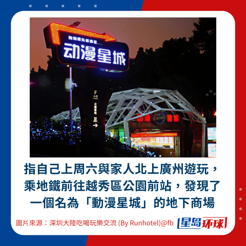 指自己上周六與家人北上廣州游玩,乘地鐵前往越秀區(qū)公園前站,發(fā)現(xiàn)了一個(gè)名為“動(dòng)漫星城”的地下商場(chǎng)