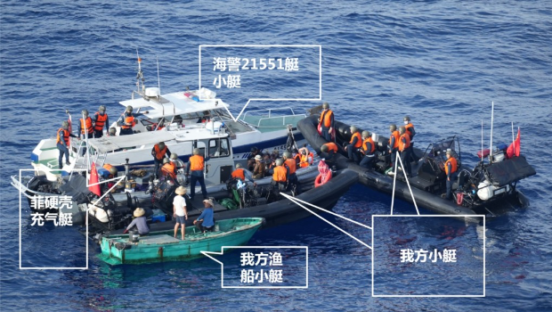 ▲中國(guó)海警在仁愛礁海域登上菲軍方快艇檢查。