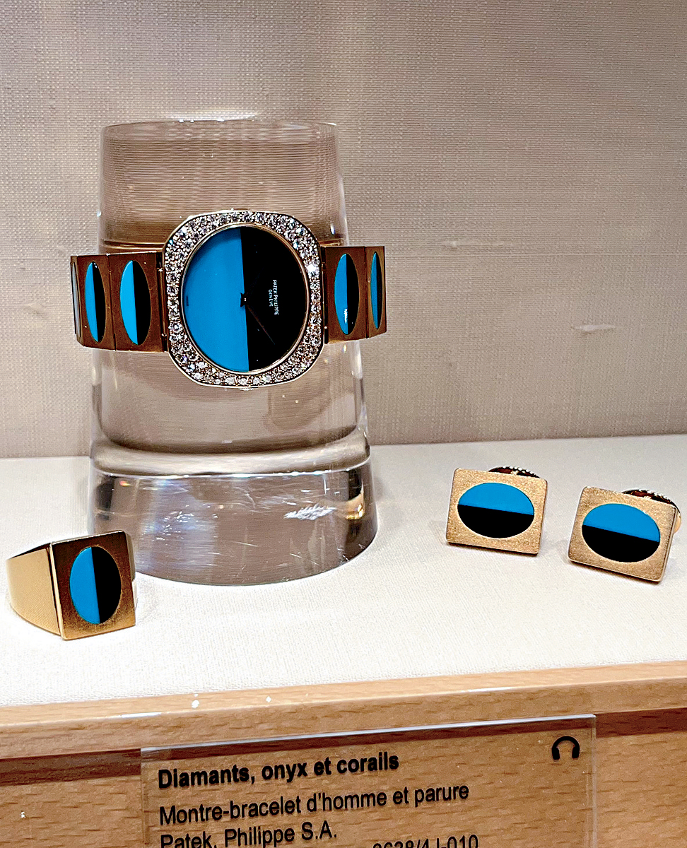▲復(fù)古色彩強烈的幾何風格,以縞瑪瑙、珊瑚及鉆石設(shè)計的腕表及配套首飾,來自1978年的品牌作品。
