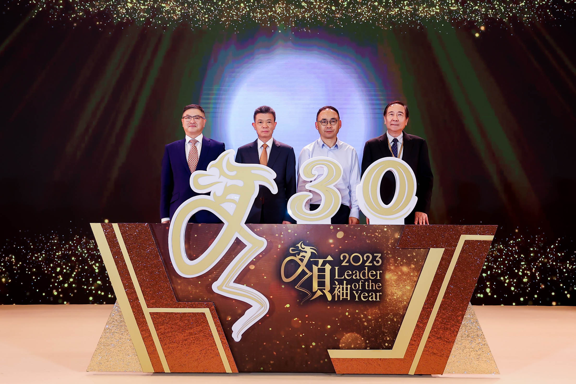 “香港杰出領(lǐng)袖選舉”迎來(lái)30周年,星島新聞集團(tuán)特別設(shè)立灣區(qū)會(huì)場(chǎng),星島新聞集團(tuán)主席郭英成先生(左二)、星島新聞集團(tuán)內(nèi)地代表賈紅平先生(左一)、鄺景廉先生(右一)及世界500強(qiáng)企業(yè)建龍鋼鐵集團(tuán)董事長(zhǎng)張偉祥先生(右二)作為主禮嘉賓,為頒獎(jiǎng)禮啟動(dòng)亮燈。