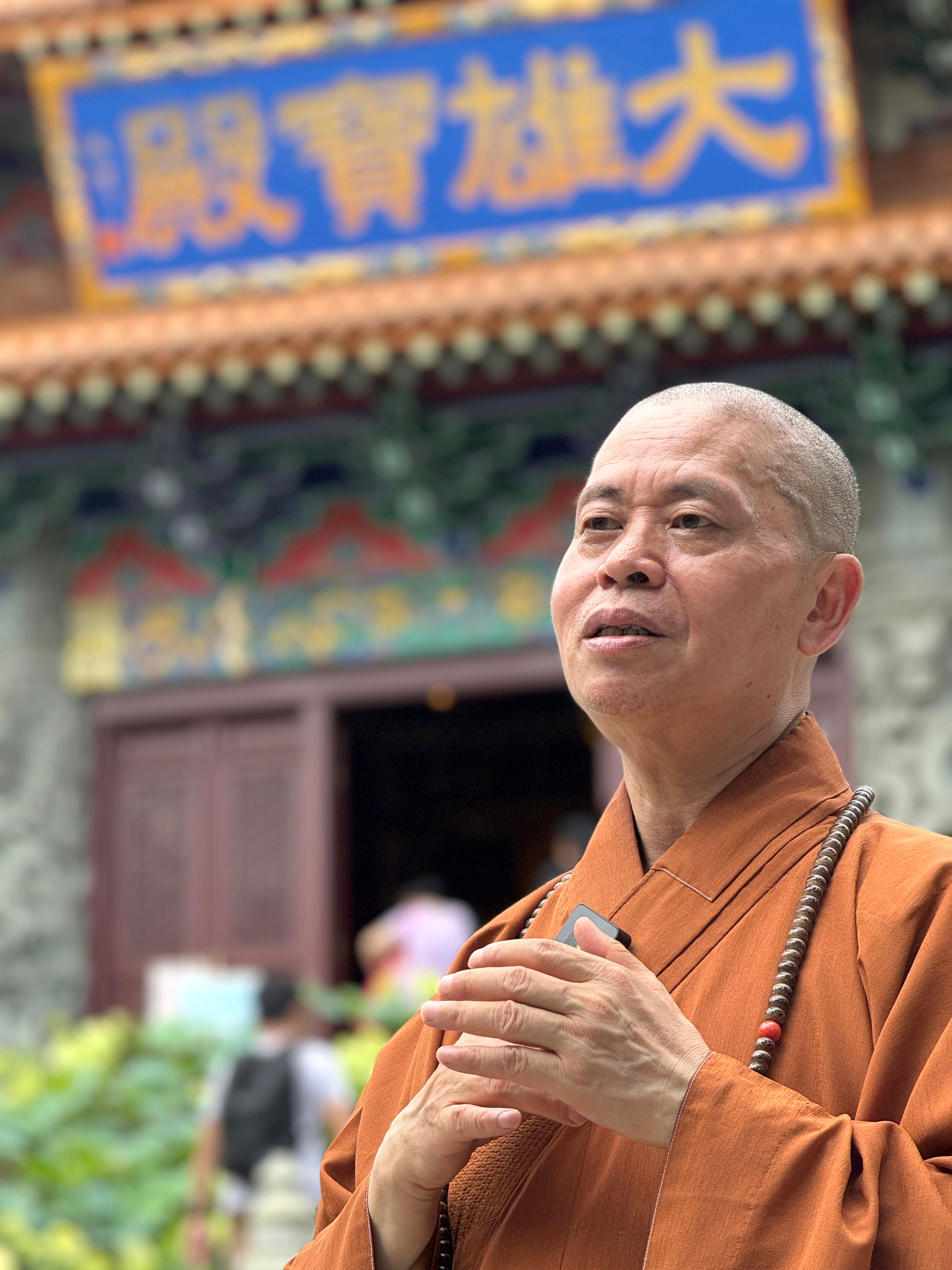 ▲寶蓮禪寺住持凈因大和尚(右)陪同文化體育及旅游局局長(zhǎng)楊潤(rùn)雄先生(中)、香港園藝學(xué)會(huì)名譽(yù)會(huì)長(zhǎng)蔡素玉女士(左)觀賞荷花。