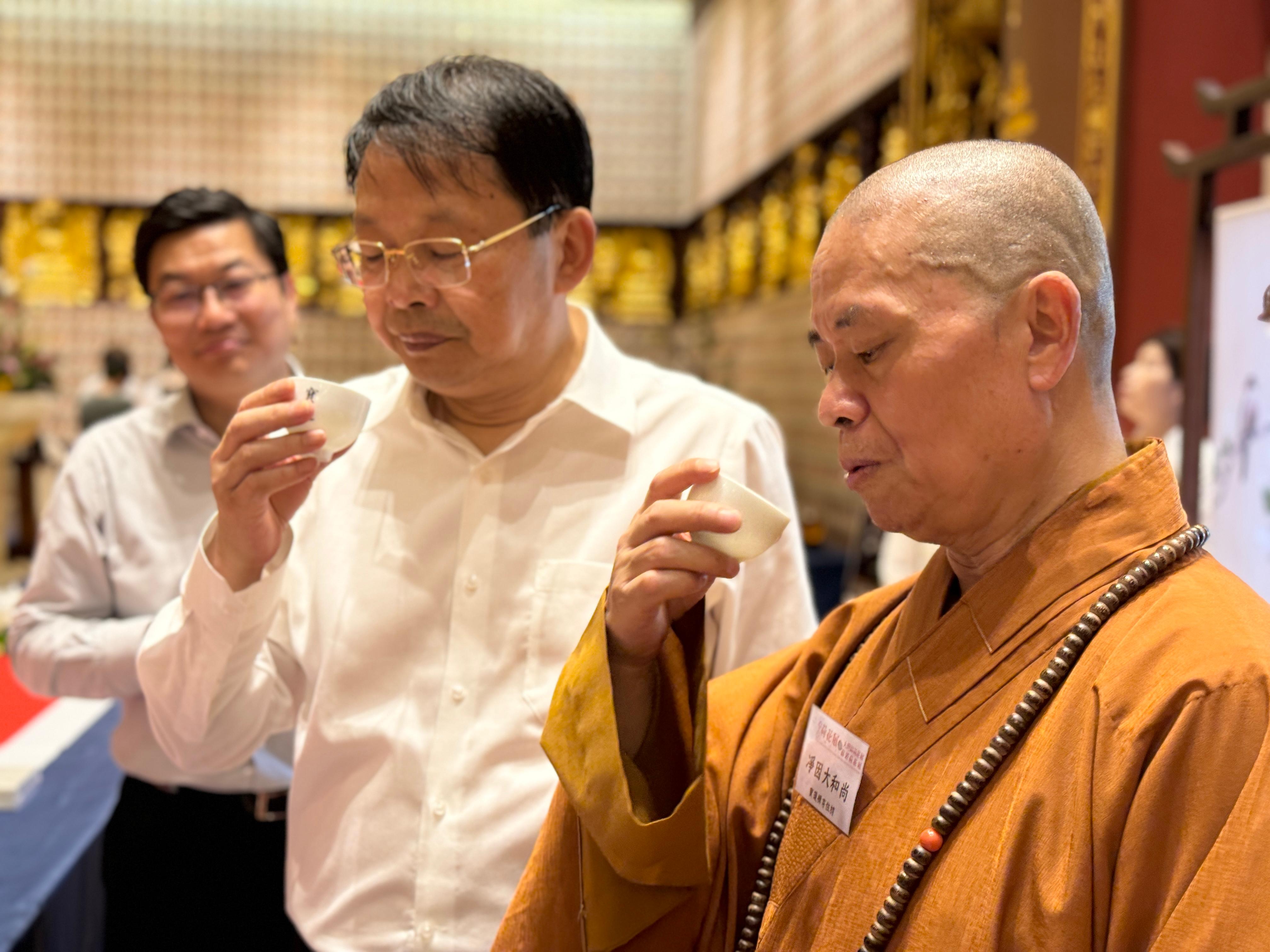 ▲寶蓮禪寺住持凈因大和尚(右)與中央人民政府駐香港特別行政區(qū)聯(lián)絡(luò)辦公室尹宗華副主任(左)參與茶道體驗(yàn)。