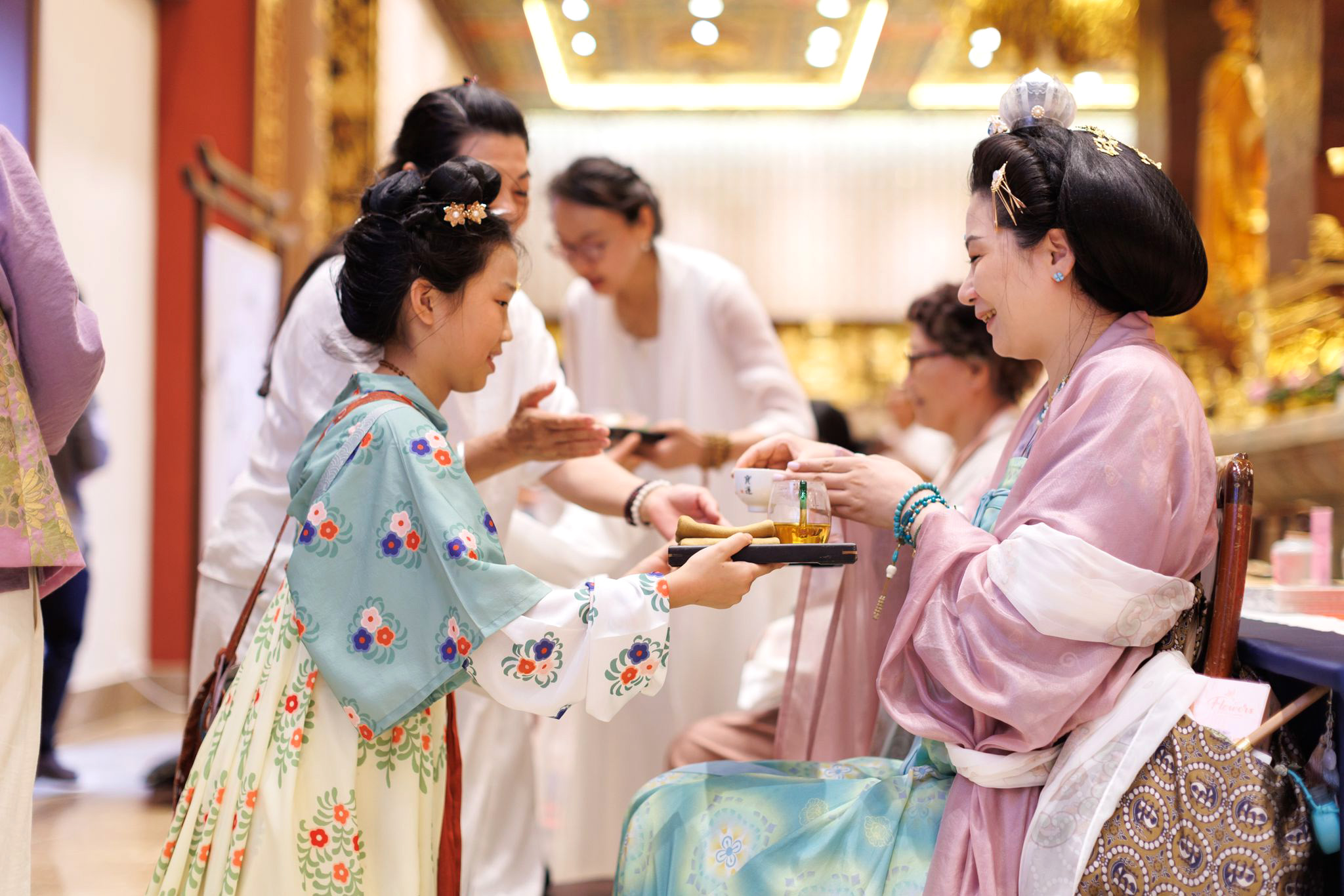 ▲筏可中學(xué)四十位學(xué)生今日于萬(wàn)佛寶殿參加「感恩尊親」茶席,以一杯茶敬奉尊親。