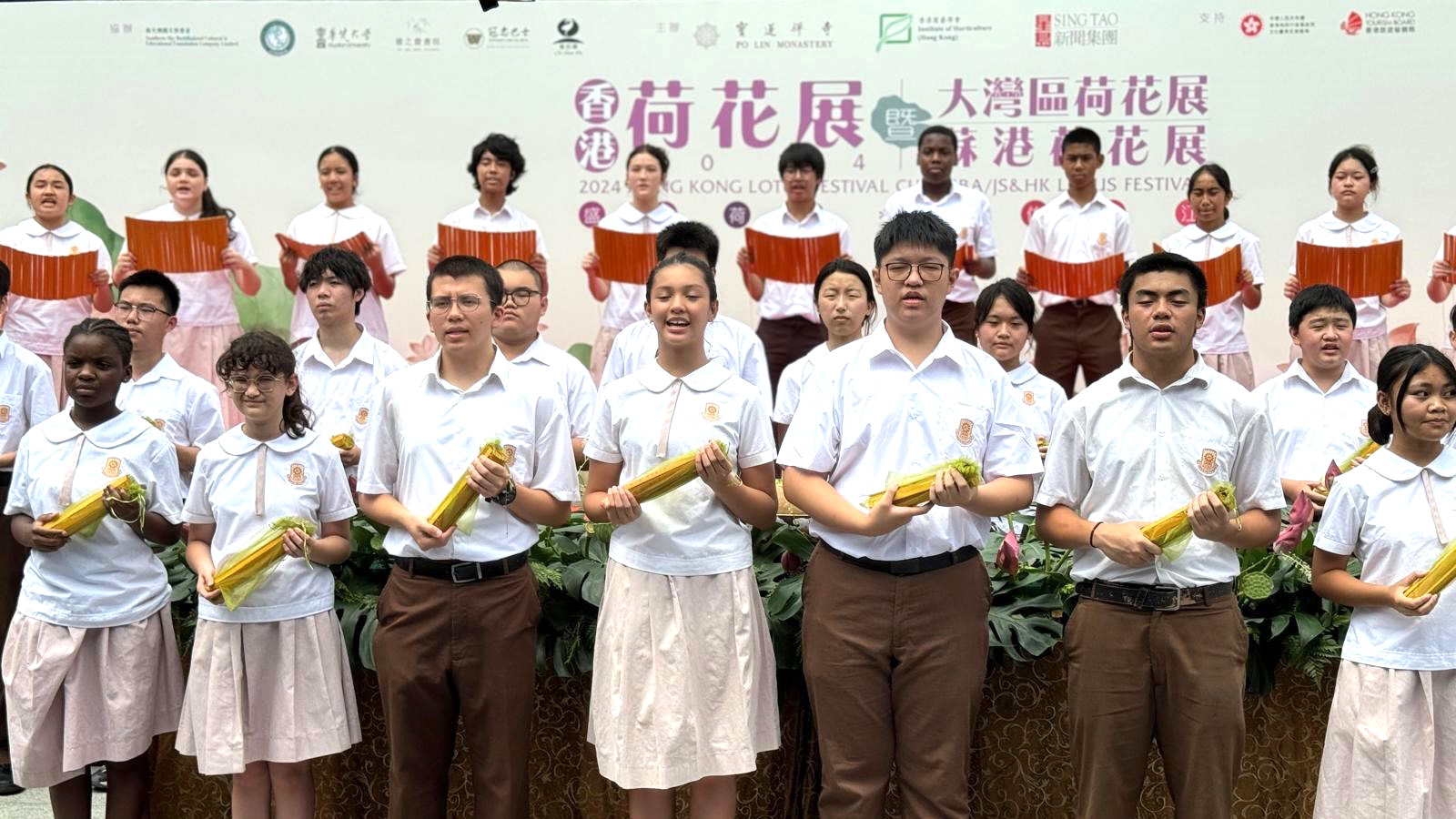 ▲開(kāi)幕禮上,佛教筏可紀(jì)念中學(xué)學(xué)生分別以粵語(yǔ)、國(guó)語(yǔ)及英語(yǔ)朗誦周敦頤的名作《愛(ài)蓮說(shuō)》。