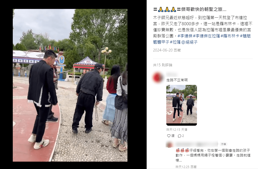 網(wǎng)民仍分享了多條與李連杰的影片,他們走訪布達(dá)拉宮、羅布林卡的宮殿群落公園、桑耶寺和海拔3800米的哲蚌寺朝圣,他透露李連杰最近狀態(tài)超好,到拉薩第一天就登了布達(dá)拉宮,更指李連杰走了8000多步。而影片所見李連杰與兩名女兒于宮殿群落公園時(shí),李連杰顯得有點(diǎn)疲態(tài),走路時(shí)竟拖住腳行,李連杰竟解釋:“沒有,我就看著很可愛,你看拴了個(gè)孩子,拿了個(gè)繩,拴了孩子……”有網(wǎng)民看過影片后留言:“走唔不正?!?,而樓主解釋李連杰是在學(xué)一個(gè)剛剛走路的孩子動(dòng)作,一個(gè)媽媽用繩子栓著一個(gè)小寶寶,走路就這樣。