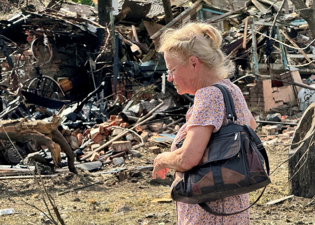 ▲一名烏克蘭婦人在被毀民宅前。 路透社