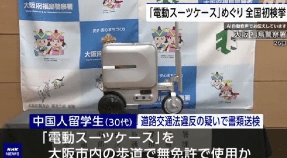 日本警方周三(26日)高調(diào)向傳媒交代案情,呼吁其他人士不要重蹈女子覆轍,違犯法律。據(jù)報,該名30多歲中國女子是名留學(xué)生,住在大阪此花區(qū),她于今年3月在中國的網(wǎng)購平臺上購買了一個電動行李箱,之后在福島區(qū)行人道上“騎乘”而行,被巡邏警員攔下。
