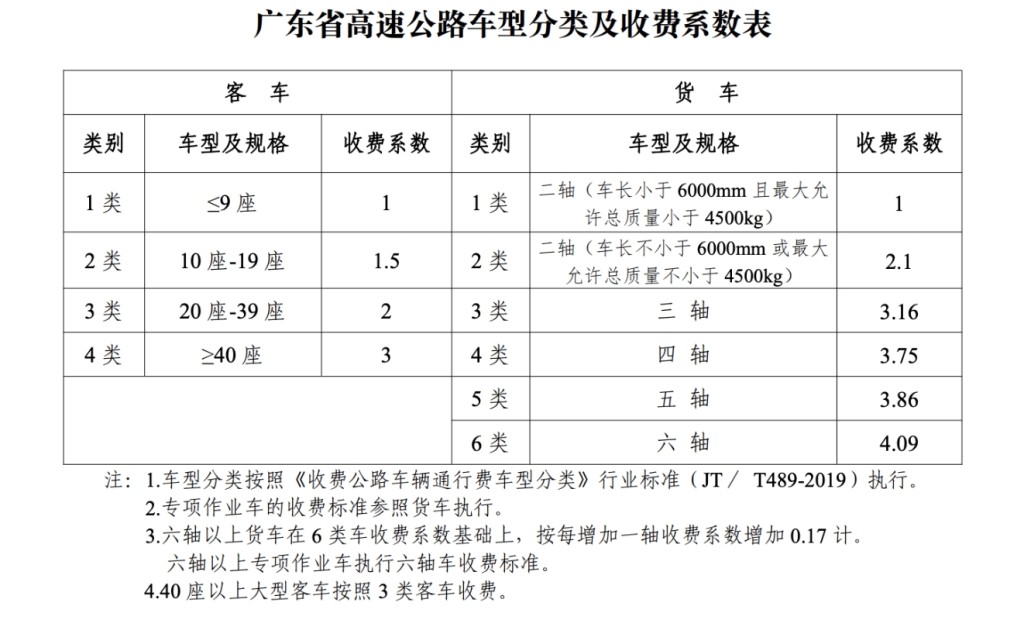 1至4類客車的收費係數(shù)分別為1、1.5、2、3,其中3類客車、4類客車收費係數(shù)按前述係數(shù)的60%執(zhí)行;1至6類貨車的收費係數(shù)分別為1、2.1、3.16、3.75、3.86、4.09,專項作業(yè)車的收費標準參照貨車執(zhí)行。