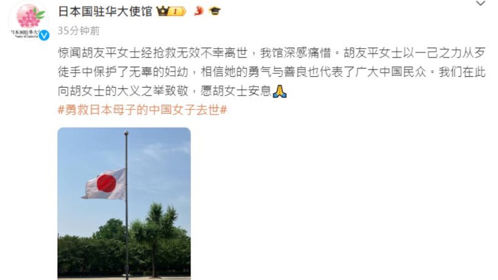 ▲日本駐華大使館下半旗,向舍身救人傷重離世的胡友平致哀。