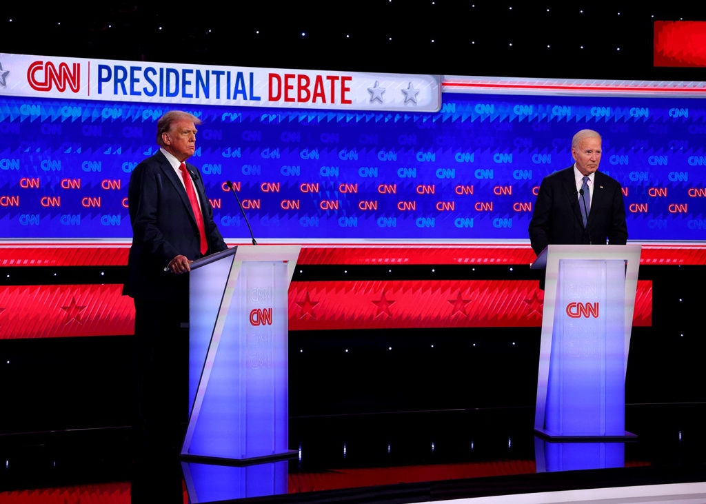 ▲美國(guó)現(xiàn)任總統(tǒng)拜登27日和前任總統(tǒng)特朗普在亞特蘭大舉行首場(chǎng)大選電視辯論。路透社