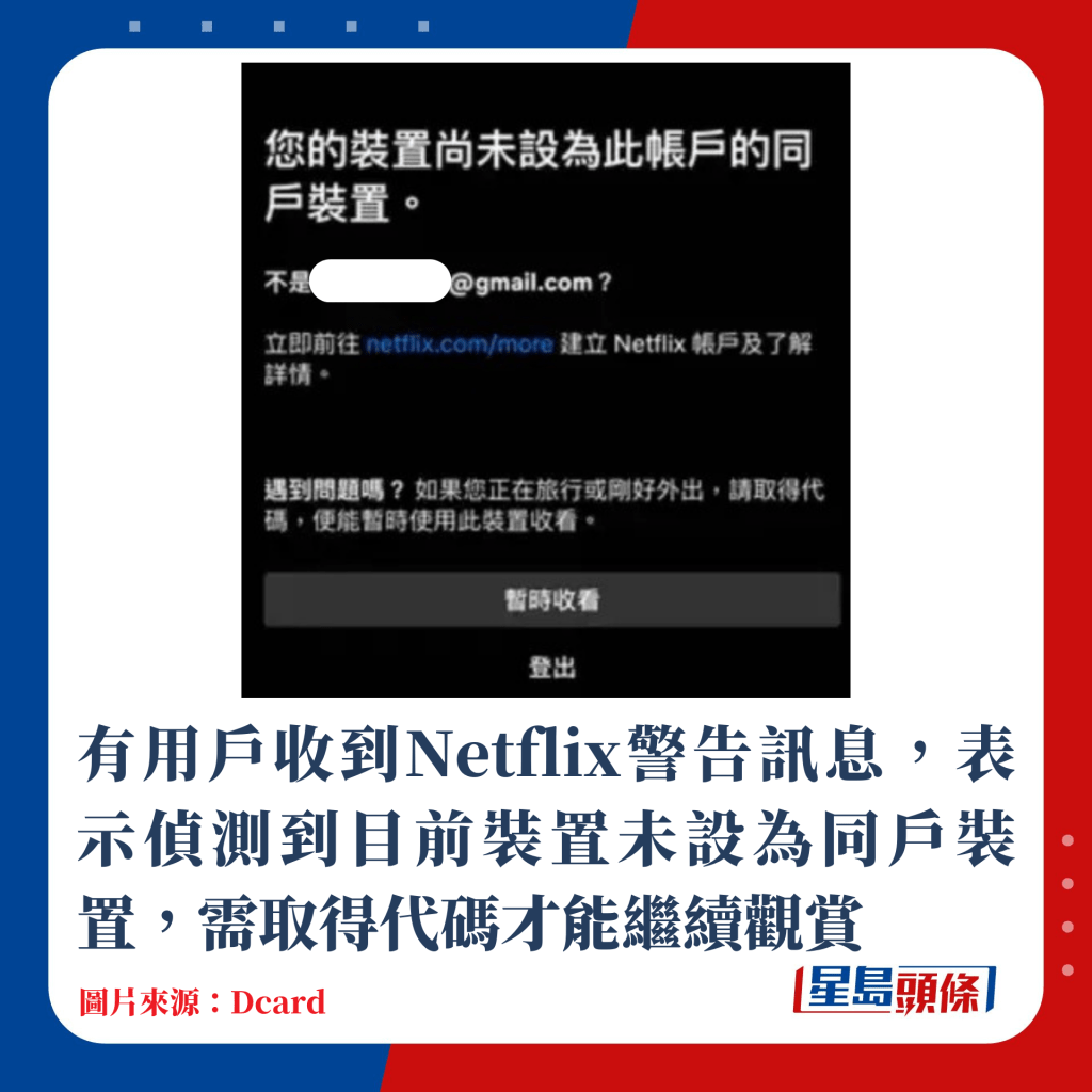 ▲有用戶收到Netflix警告訊息,表示偵測到目前裝置未設(shè)為同戶裝置,需取得代碼才能繼續(xù)觀賞