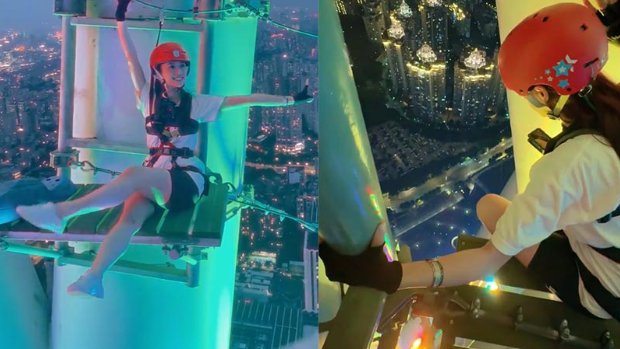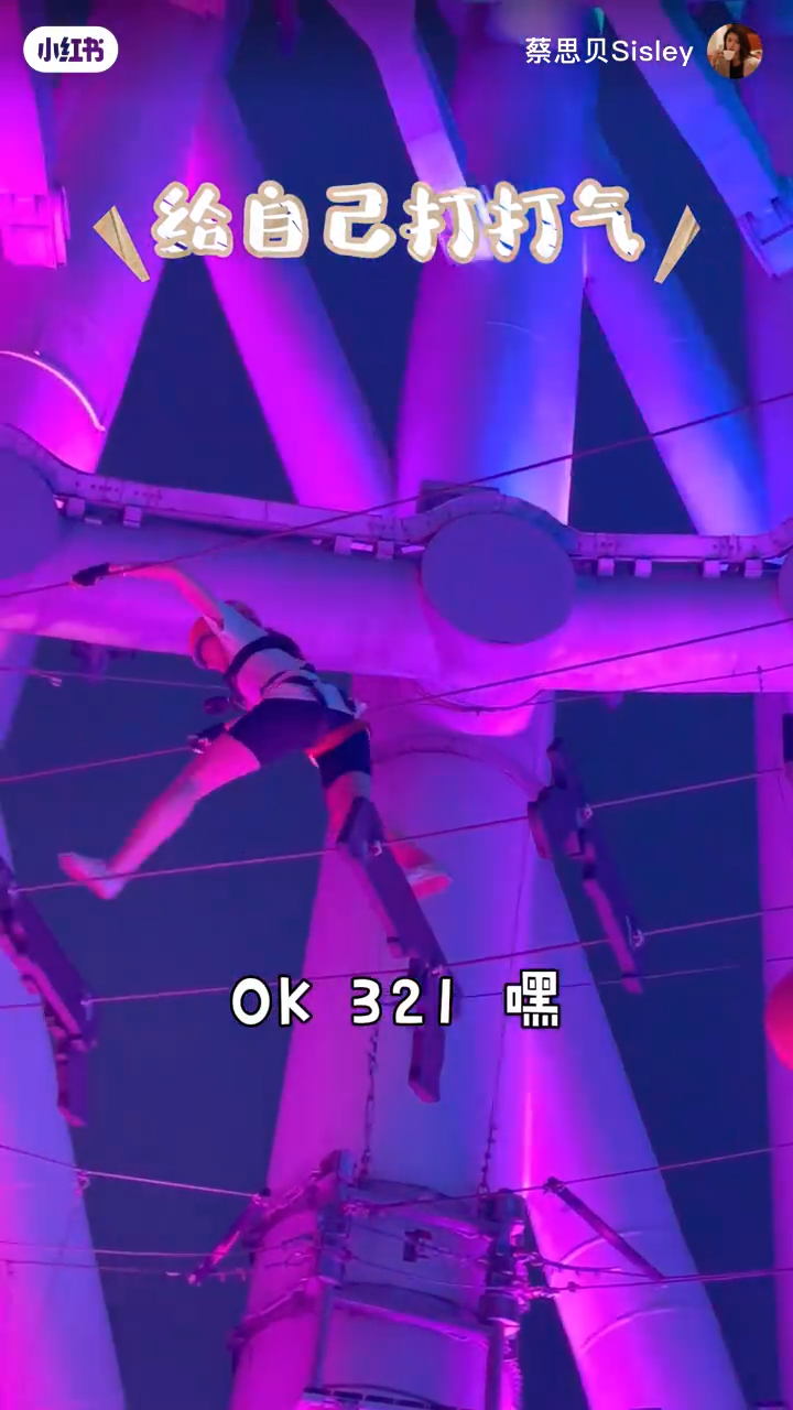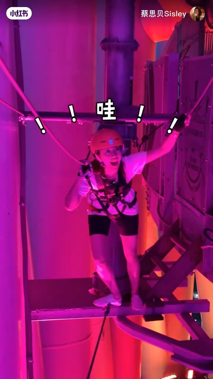 蔡思貝日前在小紅書以“解鎖新高度,廣州夜景實在是太美了!”為題發(fā)帖,影片介紹到298米高的廣州塔游玩,臨出發(fā)蔡思貝更自信滿滿地說:“應該沒有難度吧!當然沒有難度了,完全沒有難度?。∥也慌碌?!”蔡思貝所玩的刺激活動是廣州塔阿爾法探索樂園,她準備好就佩戴上安全頭盔,開始前她先在寫上“296m凌空探險/紅線”的海報前打卡然后出發(fā),她在高空踏出第一步時已不停尖叫,之后懸空踩鋼絲更貪玩地在半空扮跳芭蕾舞,她邊玩邊分享:“其實真的會腳軟,剛剛過了第一關啦!繼續(xù)gogogo”。第二關蔡思貝玩的是是飛蕩藤椅,她一度因為設施不斷搖晃而更感刺激。