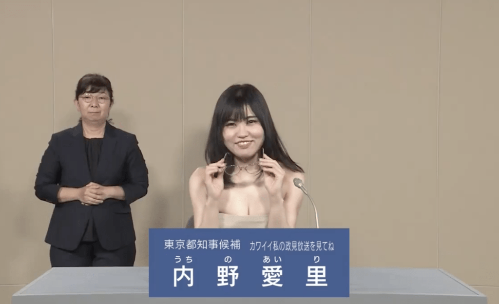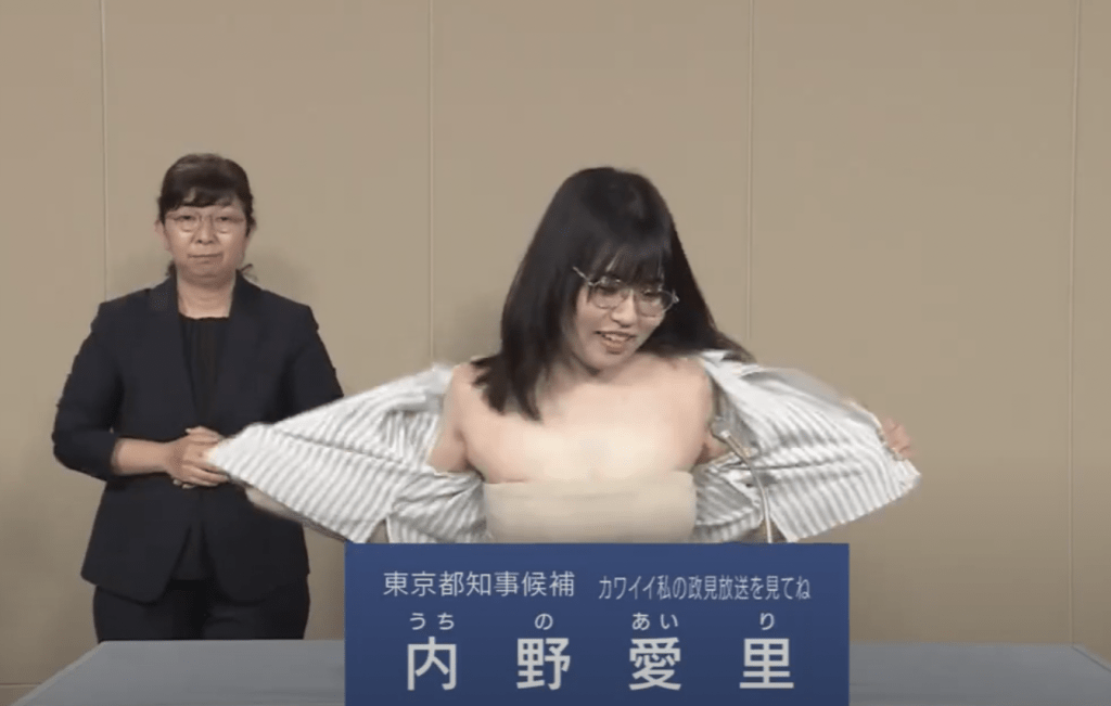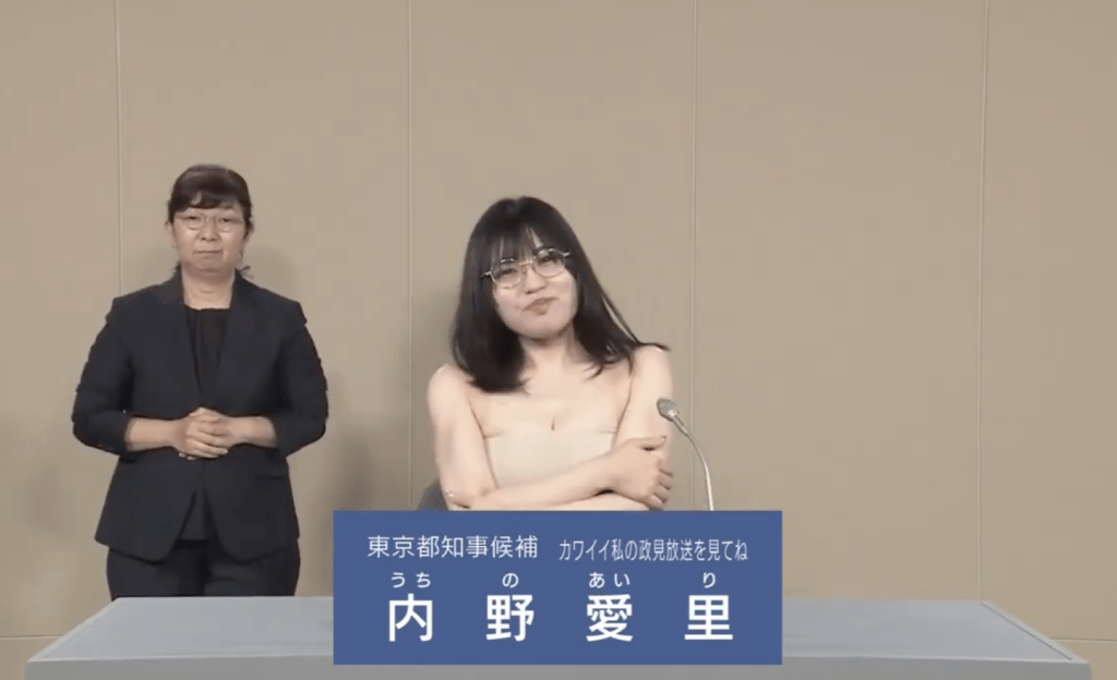 東京都知事選舉將于7月7日登場(chǎng),次候選人多達(dá)創(chuàng)紀(jì)錄的56人,伴隨而來(lái)的就爭(zhēng)議性事件亦超越歷屆。在27日的電視臺(tái)候選人政見(jiàn)發(fā)表會(huì)直播節(jié)目中,其中31歲候選人內(nèi)野愛(ài)里的詭異舉動(dòng)令人側(cè)目。