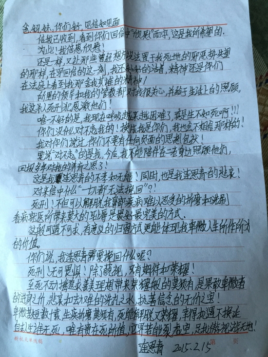 ▲連恩青給家人的信中表示對(duì)死刑沒有懼怕,反而感覺是榮耀和期待。