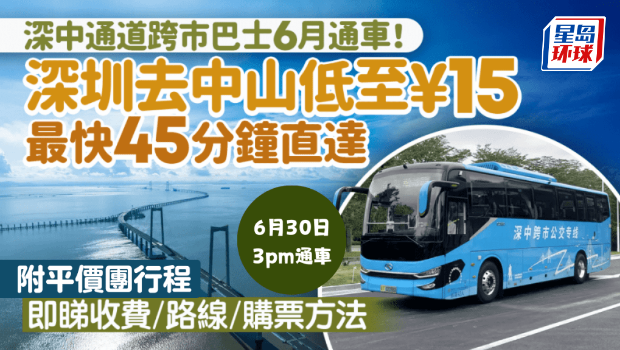 深中通道巴士通車日期、路線、車費、購票方式一文看清!連接深圳至中山的深中通道全程24公里,預計6月28日正式通車,同日會開通兩條跨市巴士專線,往返深圳前海灣至中山,票價由人民幣15起,全程最快約50分鐘,日后港人前往中山再多一個交通方式選擇!