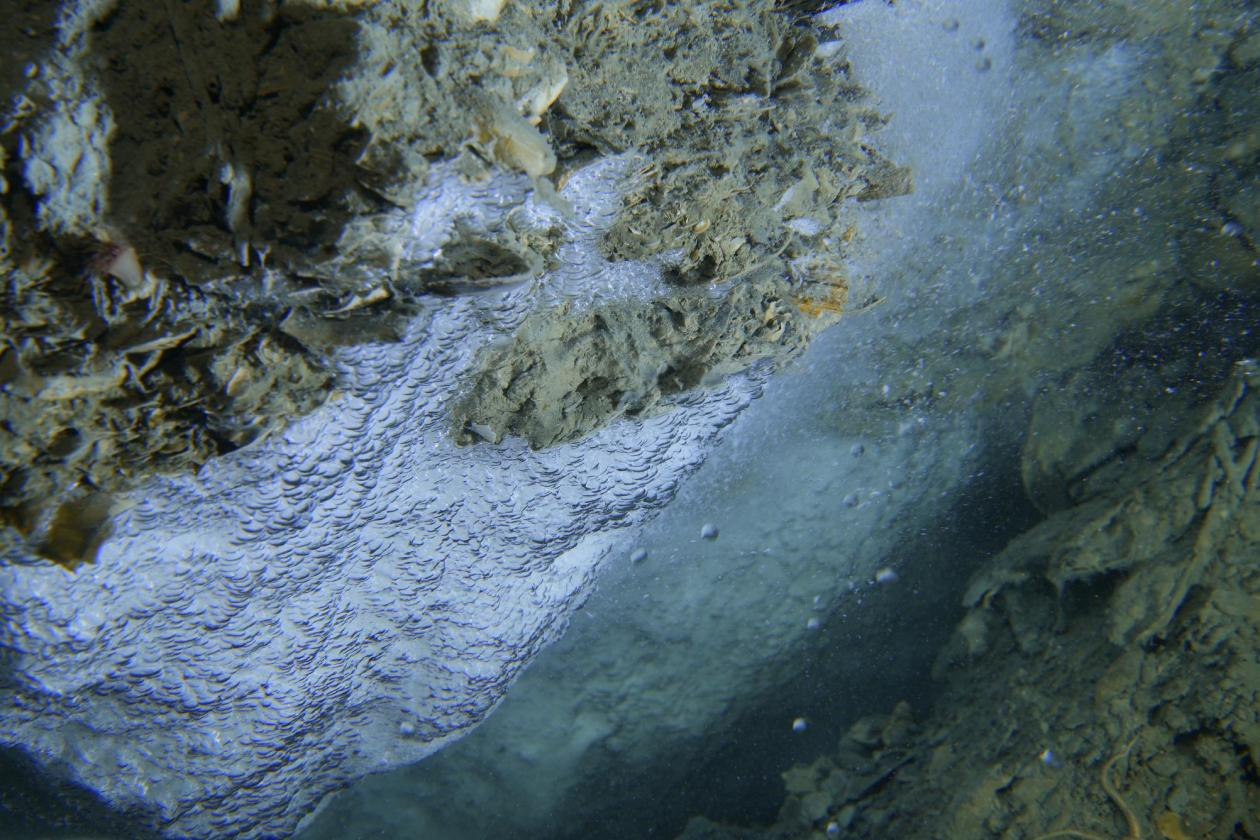 ▲“海馬冷泉”活動區(qū)自然出露的天然氣水合物(可燃冰)。廣海局供圖