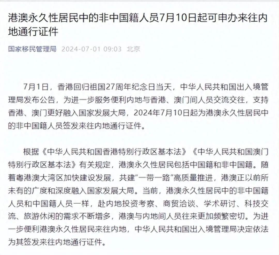 7月1日,香港回歸祖國27周年紀念日當天,中華人民共和國出入境管理局發(fā)布公告,為進一步服務(wù)便利內(nèi)地與香港、澳門間人員交流交往,支持香港、澳門更好融入國家發(fā)展大局,2024年7月10日起為港澳永久性居民中的非中國籍人員簽發(fā)來往內(nèi)地通行證件。