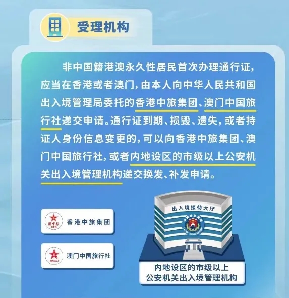 非中國籍港澳永久性居民首次申請通行證時,應(yīng)當分別向香港中旅集團、澳門中國旅行社遞交申請。