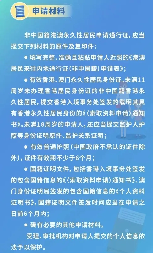 中華人民共和國出入境管理局有關(guān)負責人介紹,港澳永久性居民中的非中國籍人員可自愿申辦港澳居民來往內(nèi)地通行證(非中國籍),首次申辦通行證,由本人向中華人民共和國出入境管理局委托的香港中旅集團或澳門中國旅行社提交申請;在內(nèi)地停留期間遇到證件到期、損毀、遺失情況,可以由本人向內(nèi)地設(shè)區(qū)的市級以上公安機關(guān)出入境管理機構(gòu)申請換發(fā)、補發(fā),也可以辦理出境證件出境后向香港中旅集團、澳門中國旅行社申請換發(fā)、補發(fā)。