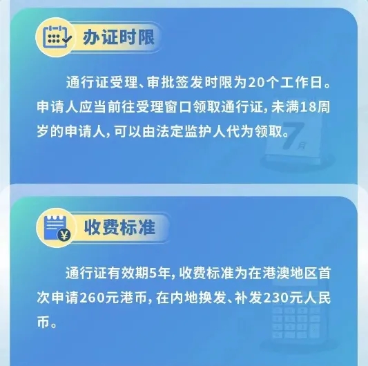 (二)通行證有效期5年,收費標準為在港澳地區(qū)首次申請260元港幣,在內(nèi)地換發(fā)、補發(fā)230元人民幣。