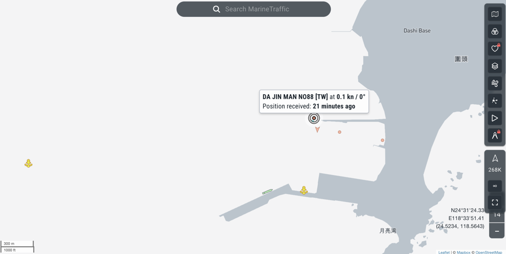 ▲在2日晚間11時許,在marine traffic網(wǎng)站中可以看到,大進滿88號目前在福建的圍頭港外,大約1海浬處,準(zhǔn)備進港。(取自search marine traffic網(wǎng)站)