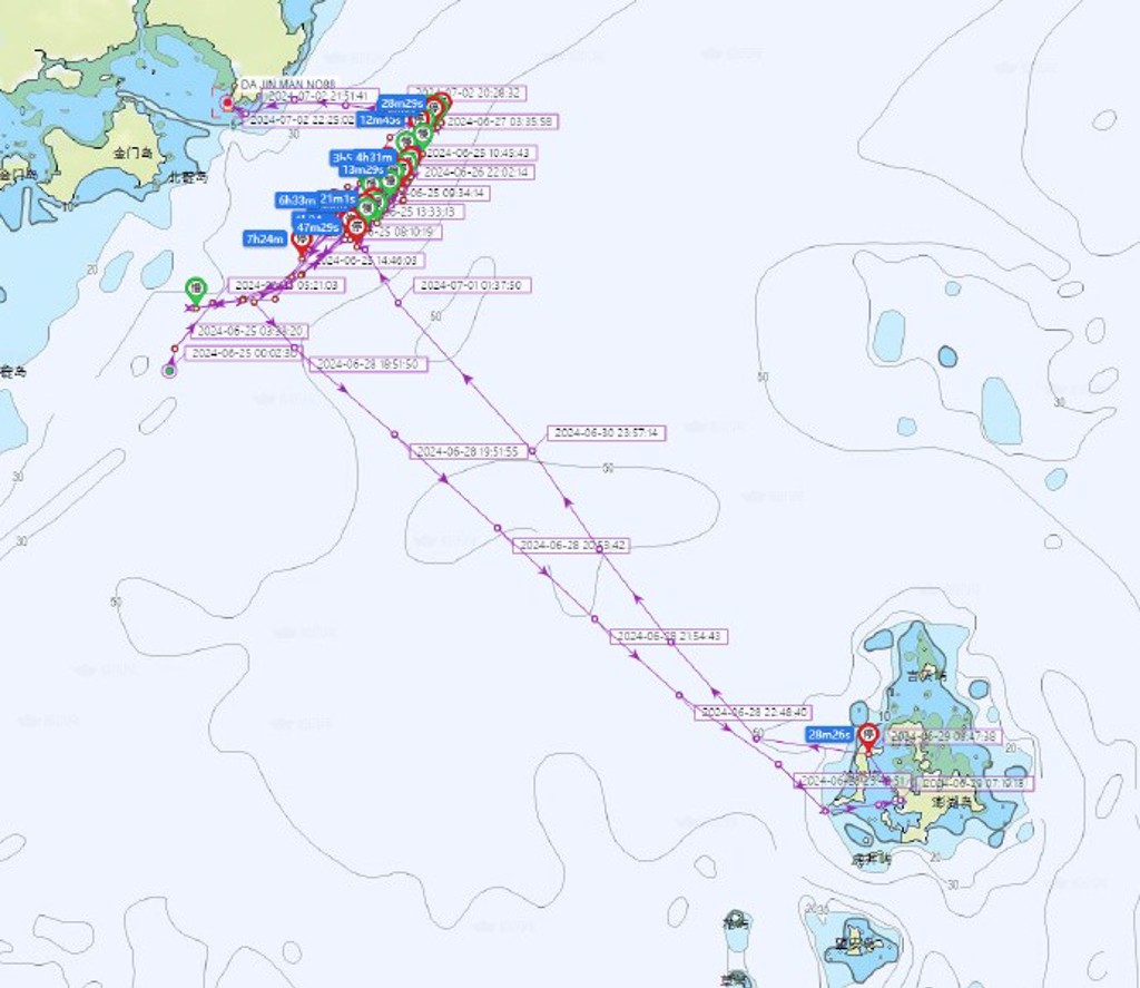 疑大陸禁漁期期間仍在“大陸腳”作業(yè),澎湖一艘漁船2日晚在金門外海北碇島附近海域作業(yè)捕小管時,被2艘大陸海警船近前搜證,并將船只帶往大陸。而根據(jù)AIS數(shù)據(jù)顯示,該船6月29日07:19自澎湖出發(fā),目前正停泊在福建泉州市晉江圍頭港內(nèi)。